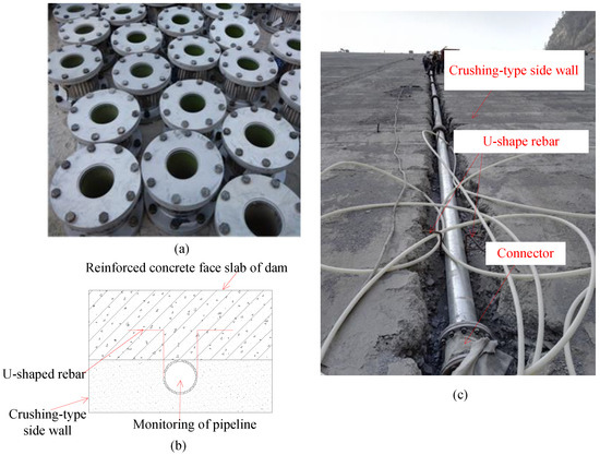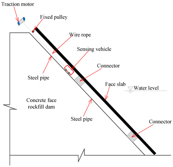 Figure 2 shows the monitoring system for face slab deformation in CFRDs, which mainly consists of a monitoring pipeline and a sensing vehicle. The monitoring pipeline is made of seamless steel pipes with a length of 5 m, and polyvinyl chloride polymer connectors with a length of 0.3 m. As shown in Figure 3a, the connector is filled with six waves of double-layer polyurethane rubber and vulcanized at high temperature to increase its flexibility, smoothness, and durability. Both steel pipes and connectors have the same inner diameter (0.178 m) to ensure the smoothness of the monitoring pipeline. As shown in Figure 3b,c, the monitoring pipeline is embedded in a slot of the crushing-type side-wall beneath the concrete face slab, and its slope is the same as that of the face slab. A U-shaped rebar is used, with its U-shaped section welded to the pipeline and its two straight ends welded to reinforcement network of the reinforced concrete face slab. In this way, the monitoring pipeline and the face slab form a permanent monitoring channel during the construction stage which then serves to reflect deformations in the CFRD in service.