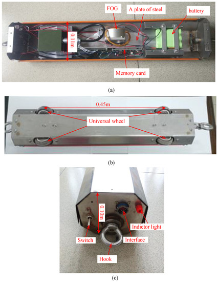 Figure 4 shows the structure of the sensing vehicle. The vehicle is 0.6 m long, 0.11 m wide, and 0.10 m high; its total weight is 8.5 kg. FOG is a core component of the sensing vehicle, which can sense changes in the vehicle’s angular velocity during the monitoring process. The data of FOG is stored in a memory card in real-time with a storage capacity of 8 GB. A 12V rechargeable battery is used as the power supply for the vehicle. A plate of steel (5.0 kg) is installed at the bottom of the sensing vehicle to increase its weight and to ensure that the vehicle can move close to the pipeline without turning over during the monitoring process. Four universal wheels are used to ensure the vehicle moves along a straight line (Figure 4b). The top panel of the vehicle is equipped with a switch, an indicator light, and a data transfer and charging interface (Figure 4c). The vehicle is controlled by a traction motor via a fixed pulley and wire robes.