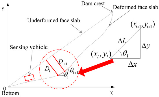 It is assumed that the slope ratio of the undeformed face slab of the dam is 1: m. Thus, the deflection of the face slab at point i is calculated as the perpendicular distance from the vehicle to the face slab:
