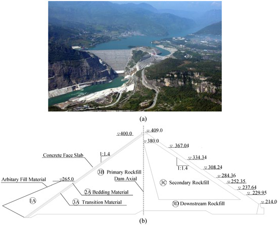 Shuibuya CFRD was constructed on the Qingjiang river in Badong county, in Enshi city, Hubei province, China (Figure 7a); it is 233 m tall, making it currently the tallest in the world. The construction project of Shuibuya CFRD was called the world CFRD landmark project by the International Commission on Large Dams. Figure 7b shows a typical cross-section of Shuibuya CFRD. The elevation of the dam crest is 409 m, and the normal water level of the reservoir is 400m. The upstream and downstream dam slopes are the same, i.e., equal 1:1.4. Construction on the dam began in October 2002 and was completed in July 2008, and it has been service since November 2008. The maximum reservoir capacity of the dam is approximately 4.59 × 109 m3. It is equipped with four generators in the underground power plant with a total electricity generation capacity of 1840 MW.
