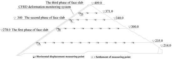 Figure 8 shows a layout of the in situ instrumentation at the maximum cross-section (0+212) of Shuibuya CFRD, which consists of the present FOG-based CFRD deformation monitoring system, 39 hydraulic overflow settlement gauges (HOSGs), and 39 tension wire alignments (TWAs). The latter two sensors are to measure vertical settlement and horizontal displacements, respectively, among which the results near the face slab (Points A, B, C, and D) are used for validation of the present FOG-based CFRD deformation monitoring system. It is also worth mentioning that, except the aforementioned instrumentation, 45 traditional inclinometers were installed during the construction of the Shuibuya CFRD; however, all of them malfunctioned because their pipelines were crushed by the high water pressure.