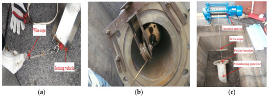 In situ monitoring of face slab deformations of Shuibuya CFRD: (a) the wire rope and the sensing vehicle; (b) the vehicle in the monitoring pipeline; (c) the working state of the system.