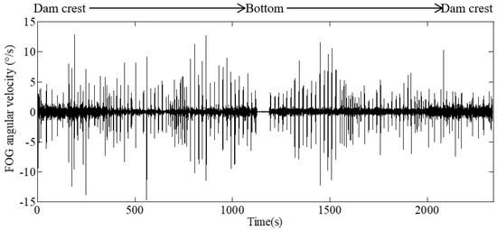 Figure 10 shows a typical set of angular velocities from the CFRD deformation monitoring system. Some of the data are about zero at the bottom of the dam, which indicates that the sensing vehicle stays at the bottom for one minute. It can also be seen that the angular velocities of the sensing vehicle moving from dam crest to bottom are almost symmetrical with those of the vehicle moving from dam bottom to crest. The data of the vehicle moving from dam bottom to crest is more stable and less fluctuant. The main reason for this is that extra angular velocities are generated because of the self-weight effects of the vehicle when it moves downward; in contrast, the vehicle will be pulled upward by the traction motor at a constant rate, and thus, it will move at a much steadier velocity. Therefore, the angular velocities of the sensing vehicle moving upward are selected as the effective measurement data in a complete monitoring process.