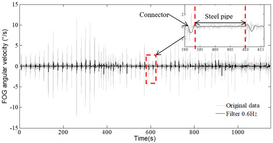 Figure 11 shows the denoised angular velocities of the sensing vehicle using a low-pass filter with a threshold of 0.6 Hz. It is obvious that the noise of the angular velocities is greatly reduced and the bone curve of the measured angular velocities is retained. It can also be observed from the zoom-in section of the curve that the angular velocities vary near the connectors, and are rather smooth in the steel pipe. This conforms to the design principle of the monitoring pipeline, which states that the deformation of the pipeline mainly occurred at the connectors, while the steel pipe underwent little deformation. It takes about 17 s for the sensing vehicle to pass across one steel pipe. The speed of the sensing vehicle is about 30 cm/s; thus, the distance that the vehicle travels is about 5 m, which is equal to the length of a steel pipe in one cycle.