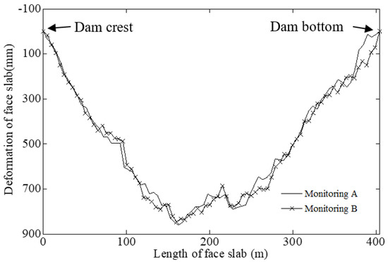 The filtered angular velocities were substituted into Equations (4)–(7) in Section 2.2.2 to calculate the face slab deflection of CFRD. Figure 12 shows the face slab deflection in two independent measurements (Monitoring A and Monitoring B) at one in situ test. The deflection has a D-shape distribution, which is consistent with results in [13,22,23,24]. The deflection shapes in two measurements correspond very well with a correlation coefficient of 0.97. This confirms the excellent repeatability in two independent measurements, indicating that the performance of the novel FOG monitoring system is stable. The final results of the deflection are calculated by the average of two independent measurements.