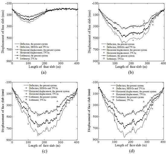 Figure 13 shows the typical deflection of the face slab measured by the FOG monitoring system and traditional instruments in different years (2007, 2008, 2011, and 2013) when the water levels of the reservoir were 274 m, 399 m, 389 m, and 376 m, respectively. The reservoir started filling on 24 April 2007, and was full (at the water level of 400 m) on 21 November 2008. It can be seen from Figure 13a that the maximum deflection was about 246 mm, which occurred at a face slab length of 100 m (at about the elevation of 235 m); the deflection above 200 m tends to be zero. As the water level continued to increase to 399 m, the deflection shape of the face slab exhibited a D-shaped distribution, as shown in Figure 13b. Meanwhile, the maximum deflection was much larger (about 620 mm) and moved to a higher position of the face slab (at about the elevation of 278 m). As shown in Figure 13b,d, the maximum deflection increased from 2008 to 2013, although the water level of the reservoir in those years was stable. This time-dependent behavior was mainly attributed to the creep effect of the dam body made of coarse granular materials with strong permeability. Similar phenomena were also reported in the Miaojiaba [13] and Daegok dams [25]. The location of the maximum deflection in Figure 13b,d was at a slab face length of about 175 m. This is consistent with the observation in [24,26] that the maximum deflection of CFRD is at about one-third to one-half of the slab face.
