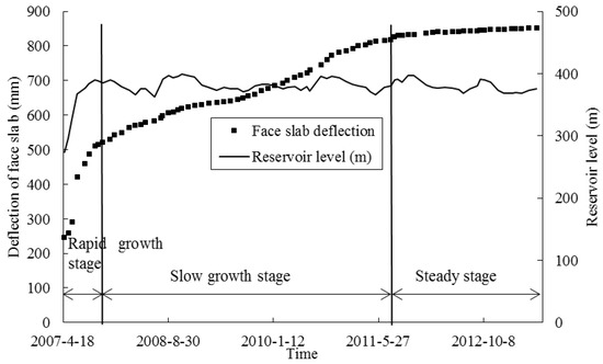Figure 14 shows the variation of the measured maximum deflection by the FOG monitoring system during the reservoir filling and in the following five years. In the figure, the water level as a function of time is also superimposed. The deformation of the face slab of the dam can be broadly categorized into three stages: (I) the rapid growth stage during the filling of reservoir (April 2007~November 2007), (II) the slow growth stage in the first three years after the end of filling (November 2007~August 2011), and (III) the steady stage until June 2013. In Stage I, the deflection of the face slab rapidly increased under the action of water pressure during the filling of reservoir. In this stage, the maximum incremental deflection was as much as 374 mm, indicating that the face slab deformation was significantly affected by water pressure. In Stage II, the face slab deflection increased much slowly, and the deformation rate was approximately 5 mm per month. In Stage III, the deformation of the face slab tended to be stable, and the deformation rate was approximately 1 mm per month. On average, the deformation rate of the Shuibuya CFRD was 3.4 mm in the latter two stages. This is consistent with the conclusion in [27] that the average deformation rate of the face slab is about 3 mm per month during the first ten years after the end of filling. The continuous growth of the maximum deflection of the dam in these two stages is because of, as mentioned, the creep effect of coarse granular materials in the dam body, although the water level was kept at an average level of around 390 m.
