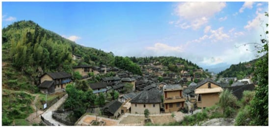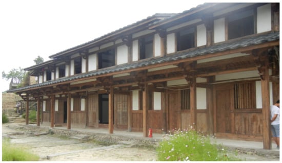 Seven Literary World, as shown in Figure 1, is located in the famous “historical and cultural village”, Guifeng village (shown in Figure 2), Fujian Province, China, which is a 257-year-old living fossil for studying the art of the Ming and Qing Dynasty. It is a two-story ancient timber dwelling with a rectangular and axisymmetric layout. The gross floor area of the building is 320 m2, and the detailed sizes of the building are shown in Table 1 and Figure 3. The structural bearing elements consist of columns, rafts, and grilles. The wall serves as a maintenance shield. As a typical Chuan-dou-type timber building, the columns and the architraves are connected by mortise-tenon joints.