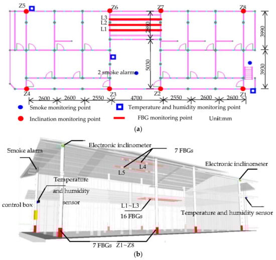 The self-devised sensor subsystem of the SHM system consisted of 56 FBG sensors for monitoring the deflection of key beams and inclination angle of columns, 4 inclinometers for comparison with the columns’ inclination angle measured by the FBG sensors, 3 temperature and humidity sensors for monitoring the ambient temperature and humidity, and 3 smoke alarms for monitoring the smoke alert, as shown in Figure 3.