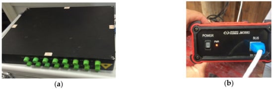 The functions of this subsystem are the acquisition of sensor data, transmission of data, and demodulation of signals. To simultaneously acquire, transmit, and demodulate all data, two sets of back-end integrated systems were arranged in the control box (i.e., terminal integrated system), as shown in Figure 4. One of them is a fiber-optic integrated system that integrates data from all FBG sensors and the other is an electric sensing system, responsible for integrating all data from electrical sensors, i.e., electronic inclinometer, temperature, and humidity sensor.