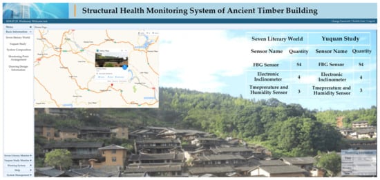 To overcome the mentioned weaknesses, the authors developed a macroscopic deformation measurement technique for Chinese traditional timber buildings based on FBG sensors []. For the purpose of applying such a technique to actual engineering, this paper developed an SHM system based on the technique and applied it to the Seven Literary World, a typical two-story Chinese ancient Chuan-dou-type timber building in Fujian Province of China. Although the accuracy and the feasibility of the deformation measurement technique has been certified in laboratory tests [], whether such a technique is applicative for practical engineering still needs to be verified due to the differences in construction, environment, and human factors between the practical engineering and laboratory tests. Thus, before the SHM monitoring system can be officially put into use, an in-situ test was carried out to verify the system precision and applicability. To guarantee the reliability of the assessment, in addition to FBG sensors, electrical sensors were also integrated into the SHM system. Two data acquisition device systems, which can respectively demodulate the FBG sensors and electric signals with high accuracy, were used in the SHM system. A self-devised visual system based on Browser/Server (B/S) mode, which enables integrated visualization of two kinds of monitoring sensors, was included in the SHM system. This work provides a new method for condition monitoring of Chinese ancient Chuan-dou-type timber buildings, laying a foundation for the damage prognosis of this type of building.
