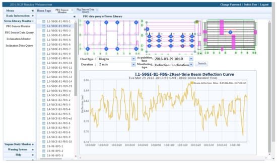 The data storage and management subsystem plays an important role in the entire system. The reason for it is that the subsystem possesses three functions, namely completing the verification of the monitoring, controlling the abovementioned monitoring and collecting process, and structured storing and managing of the obtained data. The data management included collecting, processing, analyzing, displaying, archiving, and storing all signals. Those works were mainly performed by two kinds of data processing and control software installed on the computer. The two types of software were Optical Sensor Analysis (OSA) software and Yangzhou Jingming data acquisition software as shown in Figure 6, respectively. The former manages the data from FBG and the latter manages the electric signals. After being processed and analyzed, the data is sent to the Structural Safety Assessment System server (shown in Figure 7) for structural safety assessment and generation of monitoring/assessment reports.
