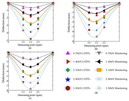 To verify the accuracy of the monitoring data, three electronic linear variable differential transformers (LVDTs) were installed on the bottom 1/3, 1/2, and 2/3 lengths of each beam during the in-situ test. The comparison between the static response data collected by the LVDTs deployed in the field and the measurement results from the FBGs of the SHM system is shown in Figure 10 and Figure 11.