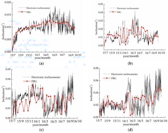 The column inclination monitoring was validated by comparing the data collected by electronic inclinometers and the results from FBG sensors within 15 months. The deformation data were collected every 15 days. In order to minimize the environmental interference on data, the acquisition time was about 20:00. The comparison results are shown in Figure 12.