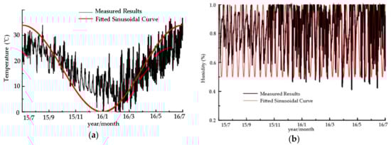 Fitted curves of temperature and humidity: (a) Temperature fitted curve; (b) Humidity fitted curve.
