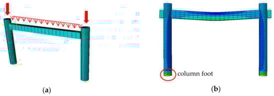 (2) Establish the mechanical performance computation model of the lounge timber frame. The static general analysis step was used to calculate the mechanical properties of the timber frame model. Loads were applied by means of concentrated loading at the top of the column and uniform distribution loading at the beam.