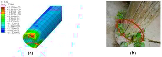 A column foot of the lounge: (a) Transverse grain stress contour plot of the column foot; (b) Site corroded column foot.