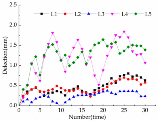 Figure 16 shows the results of beam deflection monitoring. Although the deflection values show a fluctuating variation, due to the creep accumulation caused by long-term loads and humidity changes, the overall tendency increases slightly. The beam deflection increment is in the order of 1 mm, consistent with the status of no mutations and abnormalities during this time. Each beam holds the same length, but the deflection of L4–L5 is significantly larger than that of L1–L3. The main reason is that L4 and L5 serve as roof beams under a relatively higher load level. Thus, the L4–L5 are more vulnerable to damage during service, and must be monitored emphatically.