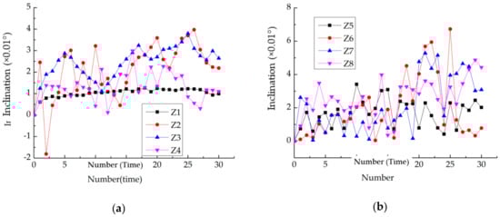 Column inclination measurement curve: (a) Z1–Z4 inclination measurement curve; (b) Z5–Z8 inclination measurement curve.