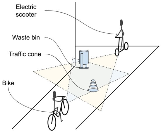 The case study used in the experiments. Vehicles are replaced by autonomous robots and street objects are replaced by boxes. The robots can be controlled better than a real bike or scooter, which allows the experiment to be replicated.