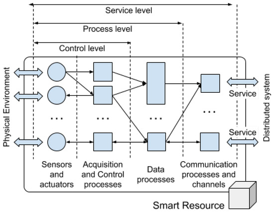 A smart resource is defined as an element of intelligent control that offers capabilities for interaction with the environment through services. As an intelligent control element, it has a direct connection to the physical environment through a set of sensors and actuators. In order to carry out control actions, the smart resource has the functions of acquisition, reactive processing, and action. Up to this point, a smart resource does not differ from a control node. For example, a traffic light with a VGA camera, a set of relays to control the light, and an Arduino Microcontroller with a network connection constitute a control node. The role of the microcontroller is to acquire and transmit images, as well as to receive orders to turn the lights on or off. However, depending on the processing capacity of the smart resource and the functionalities it offers, there will be a set of processes with a higher level of intelligence. If the device mentioned above was provided with a more powerful microprocessor that allows, for example, the storage of historical data to infer the evolution of traffic or to detect the number of vehicles waiting, it would then be a smart resource. These advanced features are offered, through services, to other smart resources or system elements.