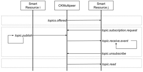 The communication protocol at the fog level is based on the publish–subscribe paradigm. The exchange of services is carried out through topics and the smart resources interact in a decoupled manner. First, the smart resources request, at the fog level, the list of available Topics through the CKMultipeer broker. As a result, they receive a JSON file with the list of services offered, features, and service quality parameters [36]. When a smart resource requires a service, it subscribes to the associated topic through CKMultipeer. CKMultipeer is responsible for automatically sending all the information published in the topics to the relevant subscribers. When the smart resource which provides the required service (e.g., smart resource i in Figure 7) publishes new information in the associated topic, CKMultipeer notifies and sends the new information to all subscribed smart resources. Subscribers asynchronously read the information; that is, by means of a notification model based on events. When the smart resource does not need to receive more information, it can unsubscribe from the corresponding topic. Additionally, smart resources can read any topic without any subscription by means of a blocking operation.
