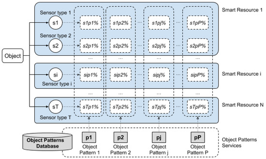 Taking into account that each object j has a specific pattern from each type of sensor i, a pattern is built with the object characteristics detected from a type of sensor. If the whole process is centralised, each device should have access to as many sensors as possible, as well as the patterns to compare with those sensors. However, the storage load of all the patterns and the processing load of all the sensors in the same device may be too much. In addition, in the case that a sensor obtains a very high probability with a specific object pattern, it is not necessary to continue processing data from more sensors, unless 100% certainty is required. Therefore, a distributed system can provide an adequate and efficient solution [37]. In this system, a device should request more results from other devices which have recognised an object only if it has a low certainty in the recognition of the object. Thus, a device only needs to have the patterns of the sensors used; moreover, it should be able to consult another device about an object, in order to reinforce the probability of the recognised object.