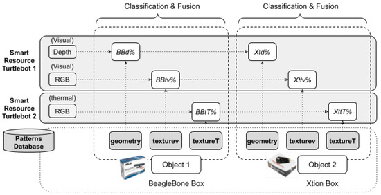 Two specific objects (the boxes in the centre of Figure 11) were proposed for detection and recognition by means of the two different smart resources. Both objects had the same geometry (boxes) but different textures (the box of a Xtion and the box of a BeagleBone).