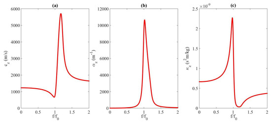 Liquids containing gas bubbles are very interesting media since a tiny amount of void fraction modifies the acoustic properties of the medium drastically, introducing dispersion, attenuation, and nonlinearity. The sound speed, attenuation coefficient, and parameter of nonlinearity are dependent on the ratio of their frequency, f, to the resonance frequency of the bubble, . They can change by orders of magnitude from one signal frequency to another [14,15]. Figure 1 illustrates the dispersive character of a bubbly medium by representing the sound speed (a), attenuation coefficient (b), and compressibility coefficient (c) vs. obtained from the development given in Refs. [14,15]. The liquid with bubbles shown here is the one used in the simulations performed in Section 3. It must be noted that this frequency dependence is similar for any other medium made of liquid and gas bubbles. The variations of these parameters with the frequency are very large. Their influence on the propagation of ultrasound is huge. Thus, at some frequency ranges, the very high nonlinearity of the medium due to the presence of bubbles is responsible for the generation of higher harmonics, difference and sum frequencies even at moderate finite-pressure amplitudes [15,16,17]. Bubbles are widely used as contrast agents in medical imaging [18].