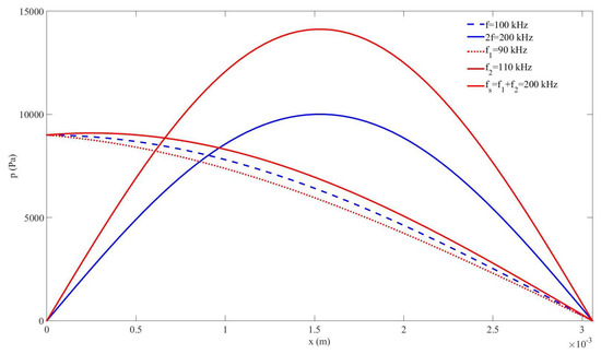 Pressure amplitude distribution of frequency components in the cavity; : blue (one source frequency), : red (two source frequencies); Source frequencies: dashed lines (fundamental and primary frequencies), nonlinear frequencies: solid lines ( harmonic and sum frequency).