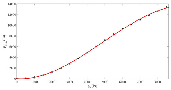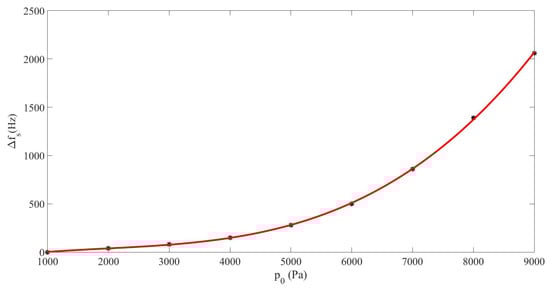 The shift undergone by the resonance frequency of the cavity was dependent on the maximum pressure amplitude reached in the cavity, corresponding to the sum-frequency component, , which depended on the source amplitude , as it can be seen in Figure 5. It fit to the third-order polynomial , where pressure amplitudes are expressed in and frequencies in . The nonlinear behavior of this shift indicates that it rose very fast with since the third-order term was positive, . This fact proves that the softening of the medium increased quite rapidly, i.e., the sound speed decreased fast, as was raised.