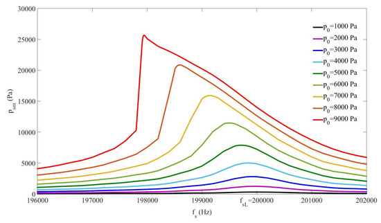 It is well known that an increase of the pressure amplitude of an acoustic wave propagating in a bubbly liquid produces a softening of the medium, i.e., a decrease of the sound speed, which induces a shift of the resonance of the cavity (nonlinear frequency shift of the cavity resonance, nonlinear resonance) [24,25,26,27]. In this section we studied whether this effect could be detected and evaluated through the analysis of the sum frequency created by nonlinear mixing of two signals of lower frequencies (). We thus analyzed the resonance of the sum-frequency component of the signal pressure in the cavity by changing the amplitude at the source. For each amplitude, we applied a frequency sweep of around the linear resonance (Section 3.2) by moving by increment , whereas remained constant during the whole procedure, to evaluate the highest pressure amplitude of the sum-frequency component reached in the cavity, , at each frequency. These values are represented in Figure 4 for all the source amplitudes used in the study. The maximal value obtained over the entire frequency range at each amplitude was then localized, which defined the frequency for which the response of the system was maximum at this amplitude. The results show that when the amplitude increased, the frequency which maximized the response shifted towards lower frequencies, which means that the sound speed decreased, i.e., the medium softened. For example, with the source amplitude the frequency that gave the highest response, i.e., the “nonlinear-regime” resonance, was , corresponding to the sound speed , which was lower than the “linear-regime”resonance, , obtained with low amplitudes. Although the change of sound-speed value was not very high, the variation of amplitude of the sum-frequency component was huge since it improved by , from ( of the source amplitude) to ( of the source amplitude).