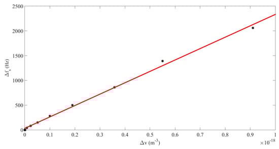 Figure 6 shows the frequency shift as a function of the increase of average bubble volume , and its linear fit , where frequencies are expressed in Hz and bubble volumes in . The shift of resonance frequency, and the corresponding change of sound speed in the medium, is due to the increment of the mean bubble volume. At nonlinear regime the volume variation of the bubbles lost the symmetry around its initial volume (at rest) and underwent a displacement towards positive volume values, i.e., the bubble oscillated around a higher equilibrium volume, and the averaged volume of the bubbles rose, which induced a decrease of the sound speed.