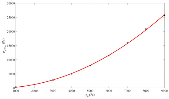The sum frequency obtained from , , by taking into account the nonlinear resonance observed in Section 3.3 was now studied. This means that we considered the “nonlinear-regime” sound speed, , at this sum frequency deduced from the value of the nonlinear resonance in the cavity of constant length found in Section 3.3: . We studied the generation of this sum-frequency in the cavity as a function of the source amplitude . Figure 7 shows the maximum amplitude of the sum-frequency pressure component in the cavity, , vs. (see Figure 4). The result fits to the second-order polynomial , where pressures are expressed in . The clear nonlinear generation of the component vs. indicates that its amplitude rose rapidly for all ranges of , since the second-order coefficient in the polynomial was positive, , which proves the efficiency of the generation for high values. The relative increases of amplitude generation of the component in relation to were very high. For example, the increase was around when .
