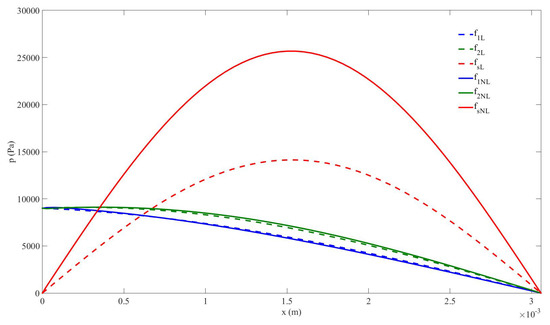 . Pressure amplitude distribution of frequency components in the cavity with ; under linear resonance assumption, , , (blue, green, and red dashed lines, respectively); under nonlinear resonance assumption, , , (blue, green, and red solid lines, respectively).