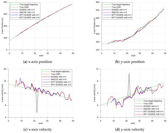 Figure 4 represents the CTTR for three targets in 500 Monte Carlo runs, and the position RMSE for Target 1 and the estimated clutter measurement density for Target 1 over time are listed in Figure 5 and Figure 6, respectively. For fair comparisons, the number of confirmed false tracks of each case was made to be almost 40 for all 500 Monte Carlo simulation runs by adjusting the initial target existence probability while the confirmation threshold was equal for all the algorithms in comparison. Using the true clutter measurement density showed that the CTTR had the fastest build-up. Even if the same sparsity order was applied, the proposed clutter measurement density estimation method provided better tracking results than the SCMDE. The closer to the true clutter measurement density the estimated clutter measurement density was, the better the performance was. At around Scan 25, when the targets were located in the immediate vicinity, the SCMDE estimated the clutter measurement density of the target measurement, which appeared to be bigger than the actual. This resulted in a slow build-up of the CTTR. By comparing the CTTR results for the sparsity order of and for the same clutter measurement density estimation methods, one could find that higher sparsity order resulted in better tracking performance because the higher the sparsity order was, the more accurate the estimated clutter measurement density was, as shown in Figure 6. The position RMSEs shown in Figure 5 were calculated for only the confirmed true tracks, which satisfied (46) such that the RMSEs looked similar in the order of magnitudes for all the algorithms in comparison as the confirmed true tracks passed the condition of (46). However, the number of samples involved in the RMSE calculation was quite different for each algorithms, as shown by the CTTR of Figure 4, which implied high reliability in RMSE for the algorithms with high CTTR and low reliability in RMSE for the algorithms with low CTTR. Figure 7 shows the true states and the estimated states of Target 1 over time for the position, velocity, and acceleration elements of each coordinate axis. Only the averaged state estimates of the confirmed tracks are shown in Figure 7. The existing SCMDE with the sparsity order of showed the worst estimation performance among the algorithms in comparison. The target tracking algorithm using the proposed MTT-SCMDE with the sparsity order of showed similar estimation performance to the one using the true clutter measurement density, and its state estimates were close to the true target states. This implied that the proposed MTT-SCMDE produced more reliable and accurate estimates for multi-target tracking than the existing SCMDE.