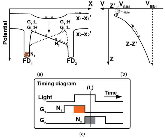 Figure 2 shows the conceptual potential diagram for the SOI-based lock-in pixel detector. By applying high negative backside bias (VBB1), a vertical electrical field is formed as shown in the right-side potential distribution on Z − Z′ (in Figure 2b). The photo-electrons generated at the deep inside of the substrate are accelerated toward the buried channel (n1). Because of the potential barrier by the p2/n1 junction and the lateral electric field created in the depleted buried channel (n1), the electrons are transferred to the central region of the pixel along the potential distribution on X1 − X1′ and then to the front surface just under the transfer gates. The photo-electrons generated at the deep inside of substrate just under the charge modulator are directly accelerated to the channel region of the charge modulator. Depending on the applied gate voltage to the transfer gates, G1 and G2, a potential slope to accelerate carriers to left to right or right to left is created at the buried channel as shown in the left-side potential distribution on X2 − X2′ (in Figure 2a). By applying the gating pulses for G1 and G2 consecutively as shown in the timing diagram of Figure 2c, the signal N1 (orange colored) as a result of overlapping of light pulse with the gating time of G1 is accumulated in the FD1 node and the signal N2 (gray colored) due to that of G2 is accumulated in the FD2 node. Since the difference between N1 and N2 depends on the delay of the light pulse, or the TOF, the TOF can be measured by knowing the charge amounts of N1 and N2. The details are described in Section 3 for the case of four-tap lock-in pixels.