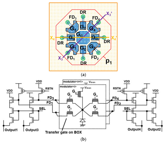 Figure 3a shows the top view of the SOI-based four-tap lock-in charge modulator. It has four transfer gates (G1, G2, G3, and G4) for transferring those time-gated signals and drain gates (GD) for draining unwanted photo-generated electrons. Generated and gathered signal charges at the front-surface of the charge modulator are transferred to one of four FDs, i.e., FD1, FD2, FD3, or FD4 by applying high voltage level to one of four transfer gates, G1, G2, G3, or G4, and low voltage level to the others. For draining signal or unwanted charges, GD is set to high level and the other gates are set to low level.