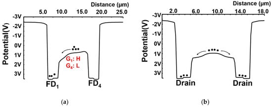 The simulated potential diagram of the designed four-tap lock-in pixel along cross-sections X3 − X3′ and X4 − X4′ in Figure 3a and 3D potential distributions are shown in Figure 4. Figure 4a,c show a charge transfer mode by G1 and Figure 4b,d show a charge drain mode by GD. For the transfer mode by G1, the gate voltage of G1 is set to high and those of the other gates (G2, G3, G4, and GD) are set to low. For the drain mode, GD is set to high and the other gates are set to low. In these simulations, the thickness of the BOX layer is set to 200 nm and the VBB2 potential of −3.5 V is applied. Even with the thick BOX layer, potential modulation in the channel is observed. Since any potential barriers or dips are not observed, a high-speed charge modulation is expected.