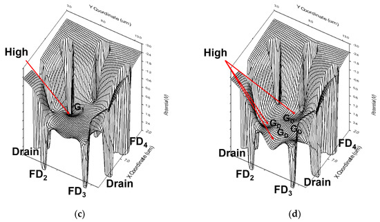 Simulation results for potential diagrams of a four-tap pixel. (a,c) G1 = high, G2, G3, G4; GD = low (Transfer mode) (b,d) GD = high; G1, G2, G3, G4 = low (Drain mode).