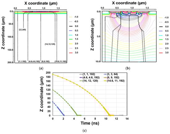 The electron trajectories of generated signal and their charge transfer time are shown in Figure 5. In the simulations, signal electrons are placed on different initial points: (X, Y, Z) = (1, 1, 192), (3, 3, 60), (4.6, 4.6, 192), (9, 9, 192), (14, 12, 120), and (14.6, 11, 192), where G1 is set to high. Figure 5a shows the electron trajectories from 0 to 200 µm and Figure 5b shows its enlarged figure from 0 to 10 µm. Figure 5c shows the charge transfer time from the initial positions to FD1. From the simulation result of Figure 5, the generated electron is transferred to the FD1 within 15 ns.