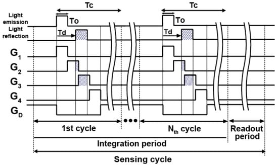 Figure 6 shows the timing diagram for the four-tap lock-in pixel operation. One sensing cycle operation includes an integration period and the readout period. Each integration period contains N lighting cycles with the period of TC and in each lighting cycle, four transfer gates are opened consecutively with the width of T0 and the rest of time are used for photo-charge draining by opening the drain gate. To obtain a sufficiently large signal for calculating depth resolution, the number of lighting cycles, N, is increased. During the readout period, the GD is always set to high and the other gates are set to low to drain unexpected signals. The accumulated signals transferred at FD nodes (FD1, FD2, FD3, and FD4) are read out through the in-pixel source followers. By using four output signals, the depth calculation is carried out. The details are described in Section 3.