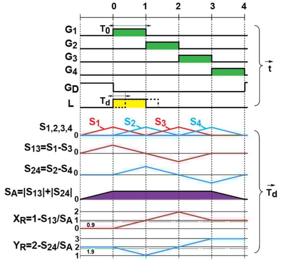 Figure 7 shows the timing diagram for the gating and the corresponding response of the signal outputs to the TOF of the light pulse, Td. The pixel output signals, S1, S2, S3, and S4, respond to the light pulse delay with a triangular shape as shown in Figure 7. Therefore, the difference of S1 and S3, S13 = (S1 − S3) and S24 = (S2 − S4) respond linearly to the TOF of light pulse within a range of 2T0. The functions of Td, calculated by the difference of the signals gated by G1 and that by G3, i.e., S13 and gated by G2 and that by G4, i.e., S24 normalized by the signal amplitude SA = (|S13| + |S24|) are expressed as: