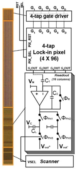 A prototype TOF range sensor with the proposed four-tap lock-in pixel is implemented using a 0.2 µm SOI detector technology [17]. The die micrograph and block diagram of the implemented chip are shown in Figure 8. Since the TOF sensor tested here is implemented in a part of a multi-purpose CIS chip, the chip area relevant to this paper only is shown in Figure 8. The TOF sensor is comprised of a four-tap gate driver, a small pixel array with 4 × 96 pixels, a readout circuit with 16 columns, and a scanner. Figure 8 also shows the schematic of the readout circuit. The readout circuit consists of a switched-capacitor amplifier (first stage) using two capacitors, C1 and C2, and two sample-and-hold circuits (second stage) using two capacitors, CL. Using the first stage, the pixel fixed pattern noise (FPN) is cancelled and the signal component is amplified by the capacitor ratio of C1/C2. In the second stage, the reset level and signal level of the first stage output are sampled in CL and the FPN of the first stage is cancelled. The sampled reset and signal levels at each column are sequentially read out using a scanner by connecting them to final buffer amplifiers sequentially. The difference of the two outputs is taken and digitized by an external 14-bits analog-to-digital converter (ADC).