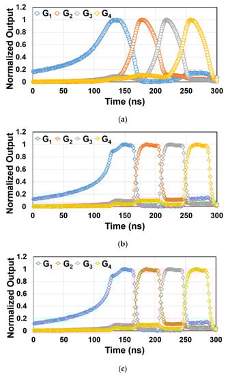 Figure 10 shows the measurement results for modulation characteristics with different backside voltage (VBB1). In this measurement, a 930 nm short-pulse laser (LDB-160B manufactured by Tama Electric Inc.) is used as the light source and is irradiated to the pixel. The pulse width and the cycle time of the laser are set to <100 ps and 520 ns, respectively. The delay time of the laser trigger is scanned from 0 to 300 ns with the step of 1 ns. The gate pulse width of the pixel is set to 40 ns. For each measurement point on the delay, the number of irradiated light pulses is set to 50. The VBB1 is set to −20 V, −30 V, and −40 V. The ideal response is a rectangular shape to the pulse delay. For VBB1 of −20 V (Figure 10a), the response to the light pulse delay is much distorted because of the slow photo-carrier response, indicating the substrate is not fully depleted but partially neutralized. For VBB1 of −30 V (Figure 10b) and −40 V (Figure 10c), the response to the light pulse delay has a rectangular shape, indicating that the substrate is fully depleted by the backgate bias voltage of <−30 V, and photo-carriers are acquired speedily by drift of the carriers in the depletion region. The modulation contrast averaged for all gates, CM, is calculated by: