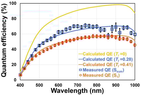 Measured quantum efficiency from the visible region to the near-infrared (NIR) region. The ideal quantum efficiencies (QEs) with various attenuation factors (Tl) are calculated by Equation (6). SSUM is the sum of signals from all the gates (S1 + S2 + S3 + S4).