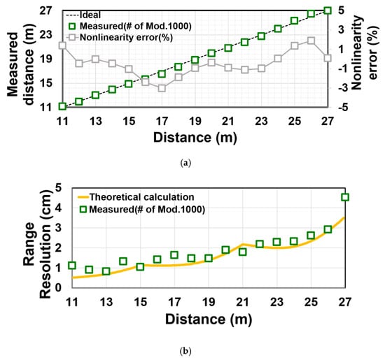 In Figure 13a, the distance nonlinearity error is measured to be +1.8~−3.0%. Figure 13b shows the measured and theoretically calculated range resolution. The theoretical range resolution, , within one time window is given by