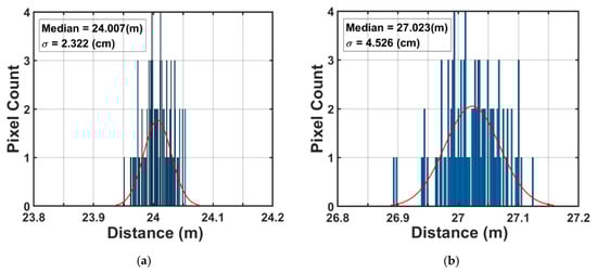 Histogram of distance at (a) 24 m and (b) 27 m.