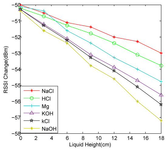 Received signal strength indication (RSSI) changes vs. liquid heights.