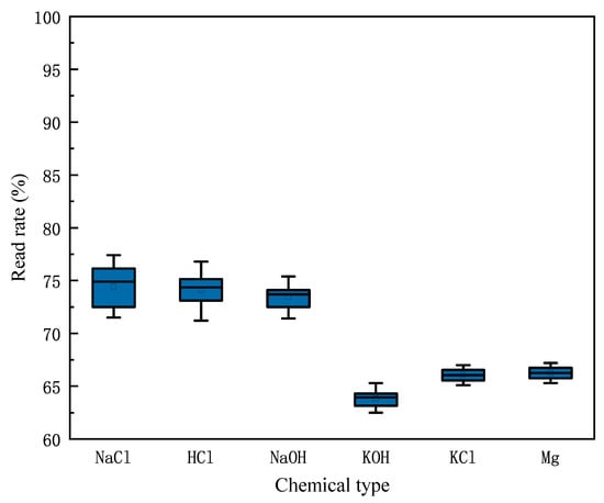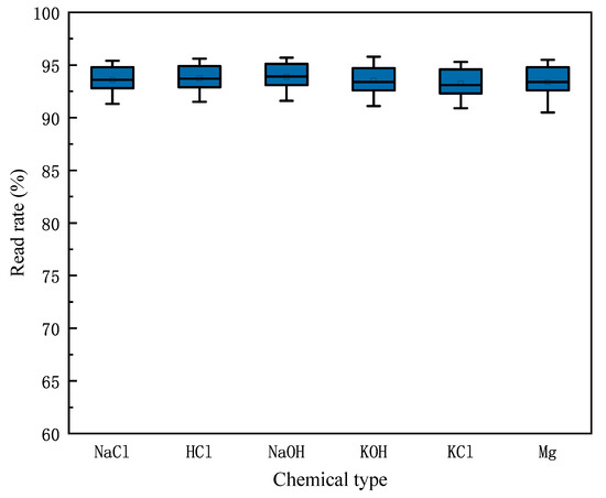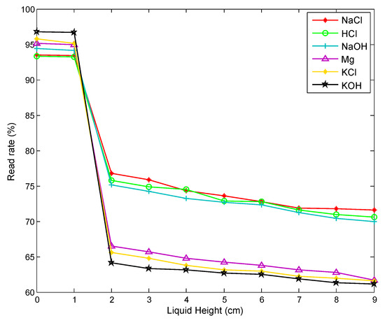 In the above, we have proposed that the reading rate of the tag is affected by the chemical in the bottle, so we observe the changes in the tag read rate when the chemicals are sufficient and insufficient through experiments. We fill the six bottles with the chemicals mentioned in Section 3.1, so that the liquid level is higher than 1 cm, which means that the remaining amount is sufficient, and test the reading rate of the tags. Then, we pour some liquid from the bottles to make the liquid level less than 1 cm, so that the remaining amount is insufficient, and we measure the read rate of the tags again. We repeat the experiments 20 times. Figure 8 and Figure 9 shows the reading rate of the tags corresponding to each chemical when the amount of chemical in the bottle is sufficient or insufficient. According to the experiment, when the remaining amount of chemicals is insufficient, the reading rate of the corresponding tag will increase, and the reading rate will be higher than 90%.